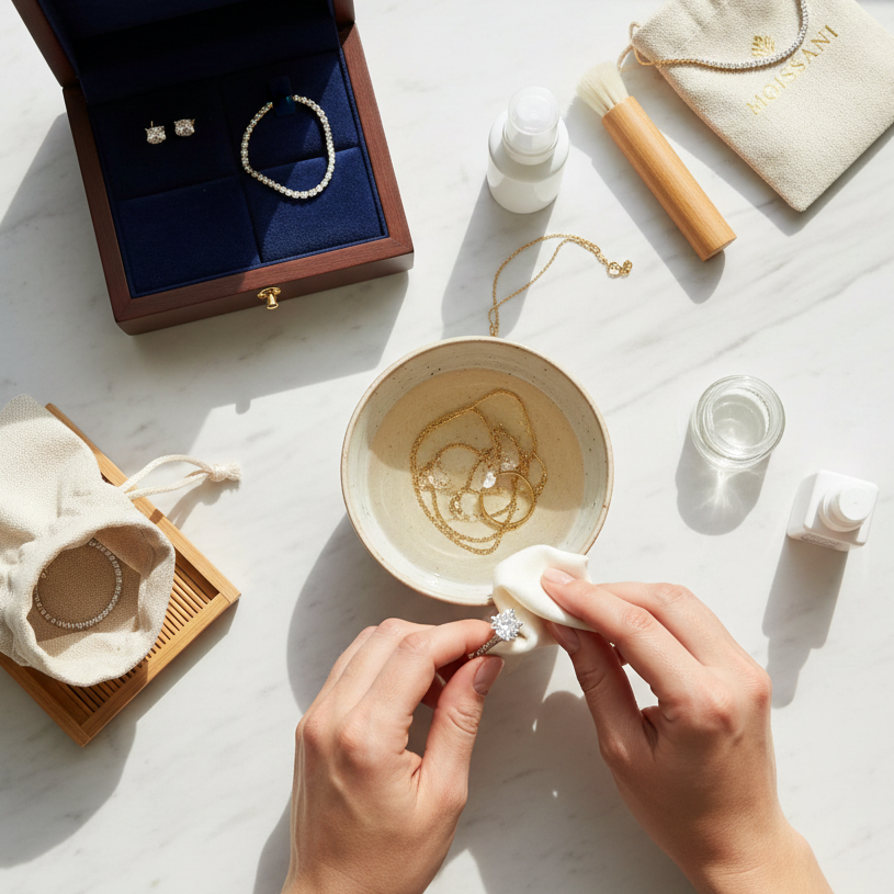 This expert guide will walk you through how to care for fine jewellery, with practical, easy-to-follow advice on cleaning, storing, wearing, and long-term fine jewellery maintenance—so your Moissani pieces continue to shine like new.Fine jewellery is more than a beautiful accessory—it’s an investment, a memory, and a symbol of timeless elegance. At Moissani, every piece is crafted with precision and care, designed to be cherished for generations. However, maintaining its brilliance requires the right knowledge and daily habits.