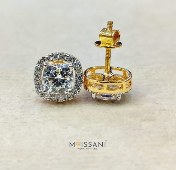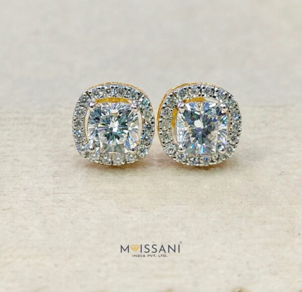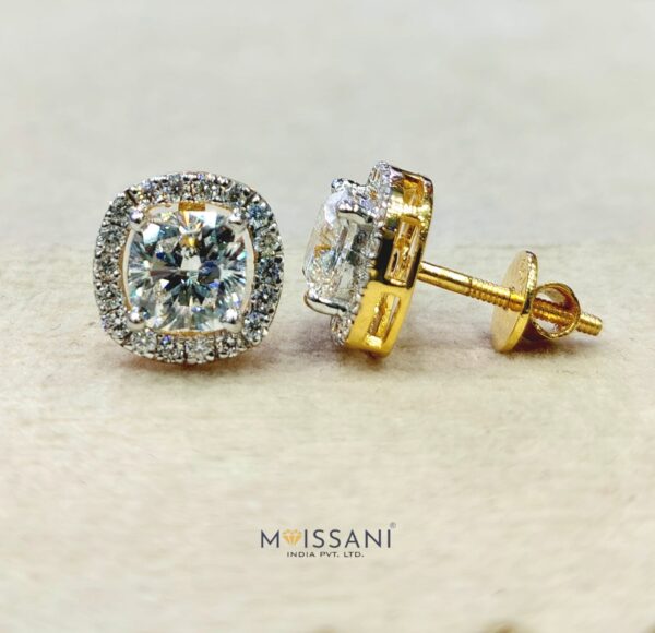 2.08ct+2.08ctLab-Grown diamond Cushion with helo 0.40ct side stone Solitaire Shape earring Gross weight 2.813gms in 14kt yellow Gold, (D color, VS Clarity) IGC CERTIFIED Everyday Wear / Wedding Gift/ Made to Order / Best Forever Gift / Party Wear / Daily Wear Earrings/ Fashionable Earring